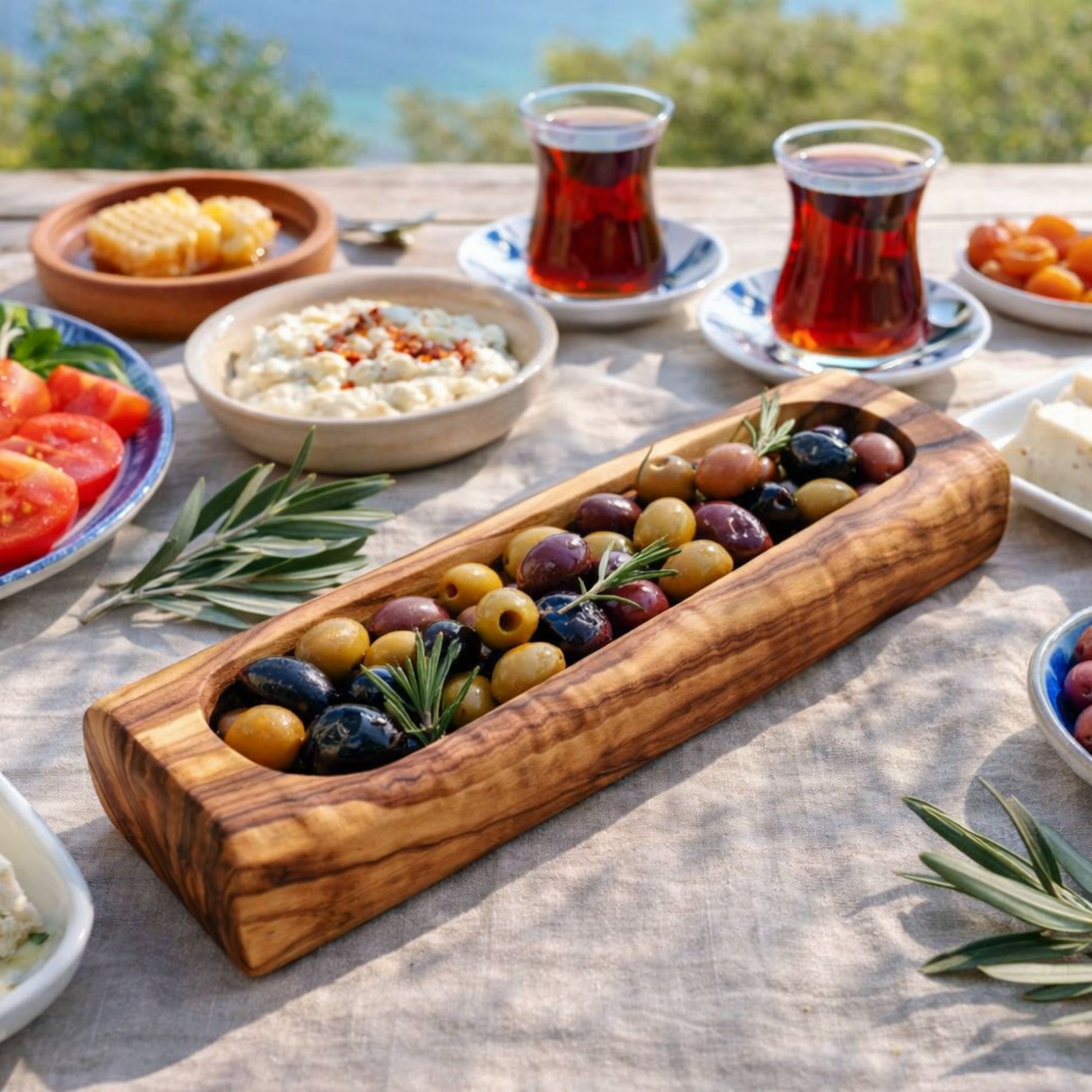 Its long and narrow design makes it perfect for serving olives, while also being ideal for nuts, appetizers, cheese cubes, or small snacks. A beautiful addition to Turkish and Mediterranean breakfast tables, this piece combines functionality with natural elegance, making it suitable for both everyday use and special gatherings.