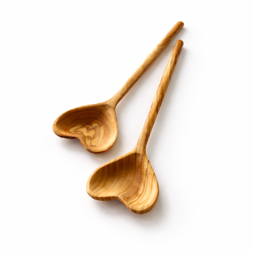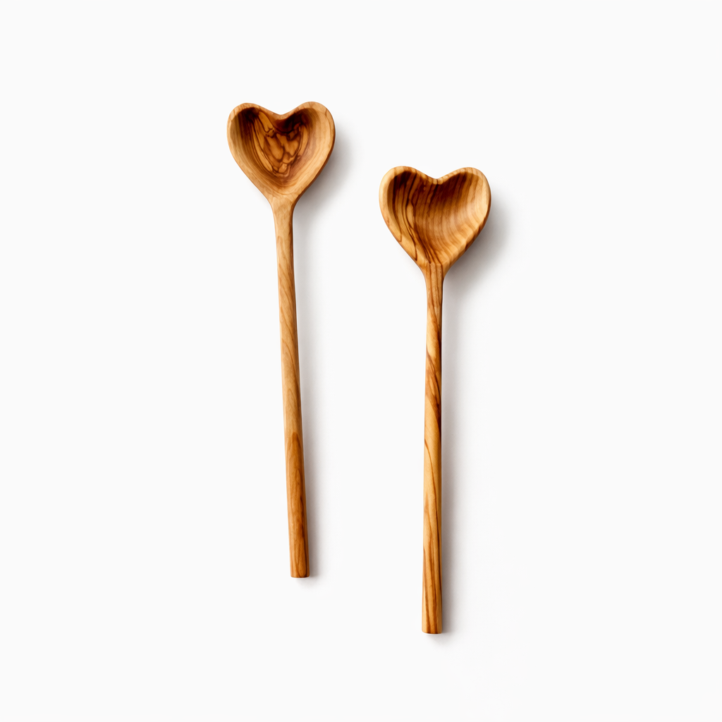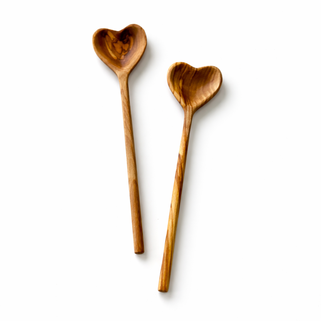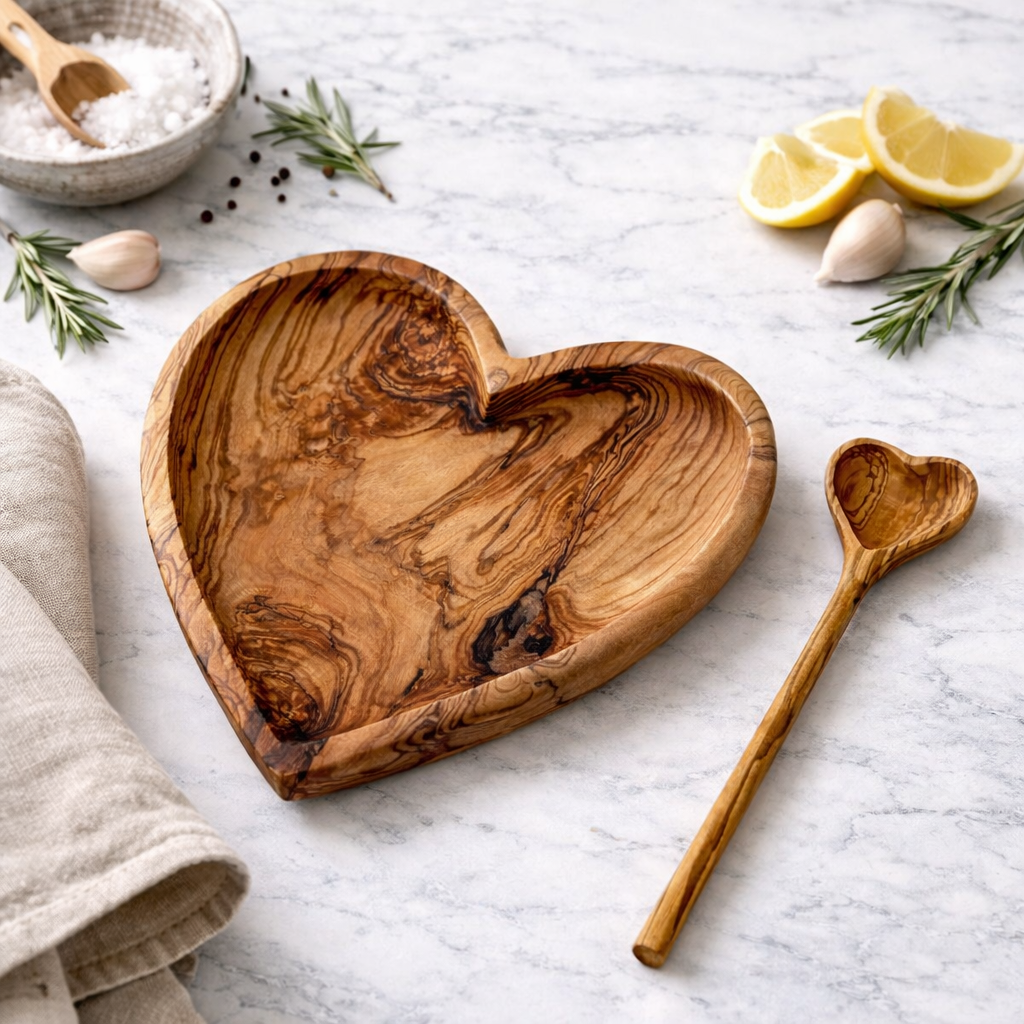 Doğal zeytin ağacından el işçiliğiyle üretilen bu kalp formlu tabak ve kaşık, hem sofralarınıza sıcak bir dokunuş katar hem de özel günler için anlamlı bir hediye alternatifi sunar.