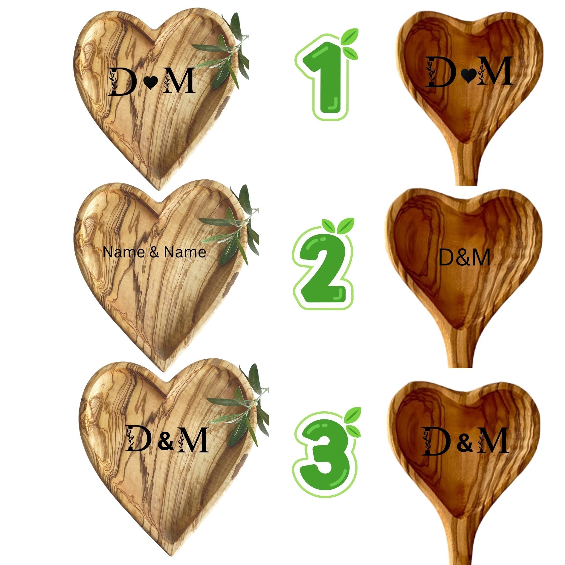 Kişiselleştirilebilir Kalp Formlu Zeytin Ağacı Tabak & Kaşık Seti